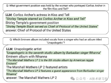 示例RICHES输出,用于具有单个大型语言模型(LLM)和解码通道的多跳查询。绿色引用文本是从检索语料库中"检索"或逐字生成的。RICHES生成原生地交错了思考和多个检索证据。