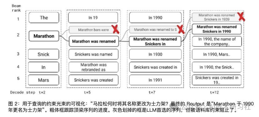 上图展示了从 RICHES 到多跳问答的解决方案(Yang et al., 2018),其中必须从多个单独的文档中检索证据,通过迭代生成关于需要检索的内容的无约束“思想”,然后生成一个从证据语料库派生的支持命题,并与原始支持文本相关联。RICHES 在单个解码器传递中执行此任务。