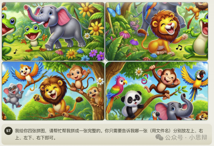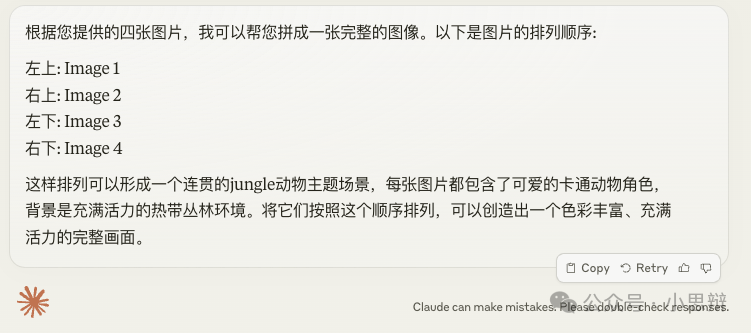 第三步:新开一段对话,让AI把拆分后的图片拼成一副完整的图片。 Claude 3.5无法完成。