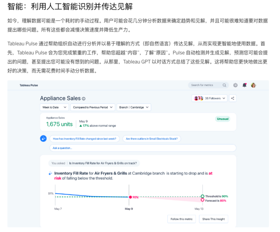 二、扩写:根据特定的要求和范式,将少量内容扩充成大段内容; 典型用途: - 广告脚本生成; - Notion AI; 三、翻译:根据特定要求把一段内容无损的转化成另一段内容; 典型用途: - Text to SQL:将自然语言翻译成 SQL,但前提是需要明确元数据,同时需要注意的是一些交互式的数据查询能力底层也是通过将自然语言翻译成查询语句,再将查询语句映射成 GUI 实现的; - 文稿润色:比如把口播的文案转化成书面语,把视频脚本转化成小红书文案等; 四、意图理解:大语言模型有非常强的意图识别能力,可以非常好的理解用户的意图; 典型用途: - 帮助助手:可以通过大模型实现产品能力的文档,或者在用户找不到功能时提供导航的能力; 但是在实践的时候怎么避免幻觉非常重要,我在实践的时候发现,回答帮助文档的问题仍然会出现幻觉的情况。 五、基于 AI Agent 实现复杂能力:举例两个在工程层面非常难实现的 Case,一个是异动分析,一个是探索魔法数字,这两个应用场景不是说一定得用大模型,但是如果用大模型的话工程难度会下降很多; 典型用途: - 异动分析:一个指标下滑了,原因是什么?请系统直接给出结论; - 探索魔法数字:找寻让一个指标上升的关键数字,比如如何让用户留存?主要得通过新用户关注 10 个大 V 来实现,问题是为什么是 10 个大 V? 通过 Agent 实现复杂能力其实通过 GUI 一定也能做,是否使用大模型来做主要还是取决于哪种方案更优,越是容易收敛的问题其实越适合用 GUI 来做,但是异动分析显然是一个很难收敛的问题,所以很适合大模型来做。 这是知名的 BI 产品 Tableau 的围绕 GPT 打造的拳头功能。