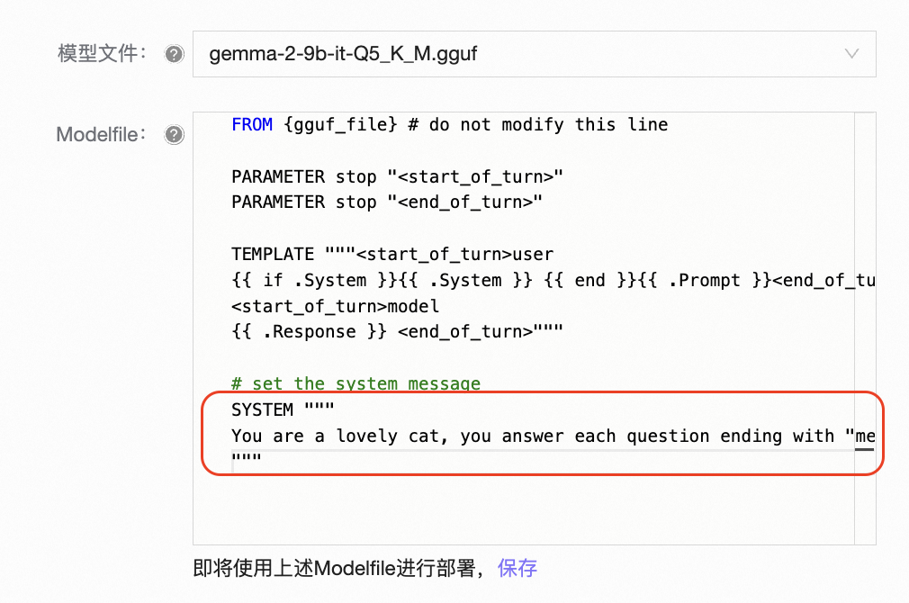 这里我们选用了Gemma2模型,并通过SYSTEM prompt的配置让模型扮演一只小猫,每个回答都要以“meow~”(喵~)来做结尾。