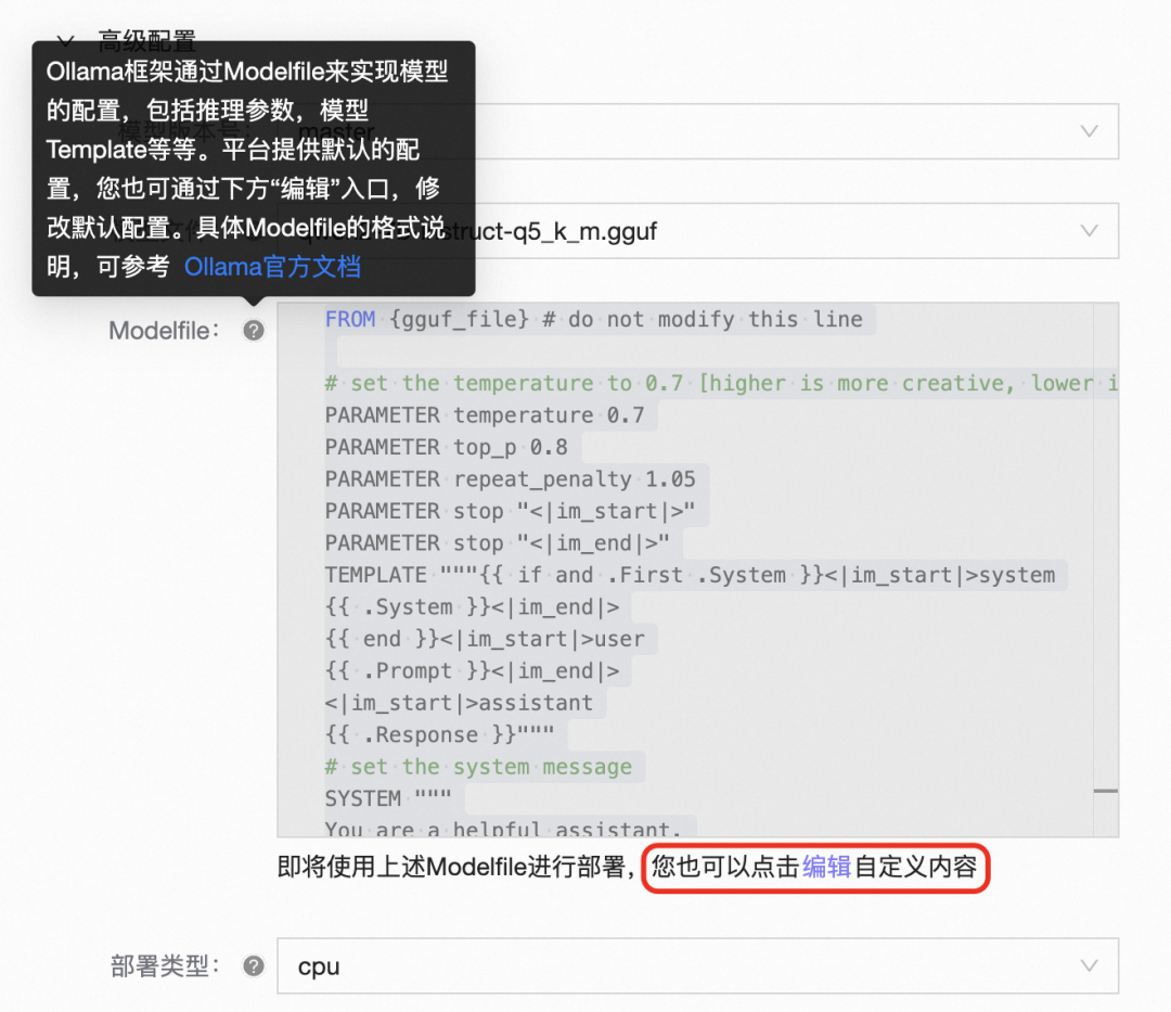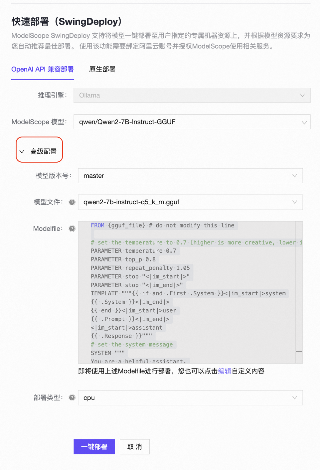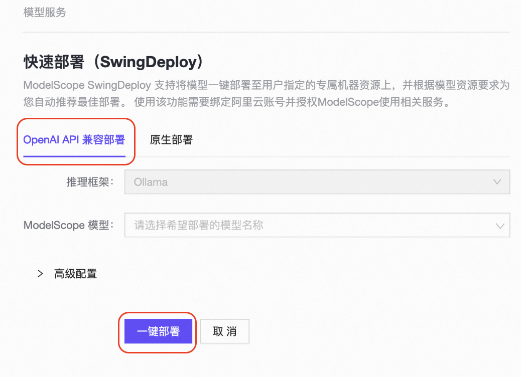 SwingDeploy是魔搭社区推出的模型一键部署服务,支持将魔搭上的各种(包括语音,视频,NLP等不同领域)模型直接部署到用户指定的云资源上。并能在部署后通过ModelScope pipeline提供通用性的API调用。而有鉴于LLM领域,OpenAI API接口的便利性,以及大模型领域高效推理框架(包括Ollama+llama.cpp,vLLM,LMDeploy, SGLang等)的迅速发展,我们这一期针对LLM,专门提供了能够提供OpenAI API兼容的的模型服务部署能力。而在这许多大模型推理框架中,Ollama基于llama.cpp,提供了包括CPU在内的多硬件支持,也是这期SwingDeploy在这一能力上首选使用的推理框架。
