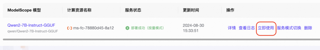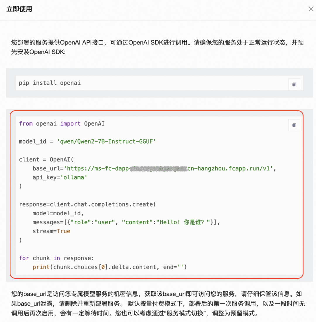 部署完成后,就可以直接使用OpenAI API来调用Qwen2-7B这个模型了。从“立即使用”入口,就可以获取使用的范例代码:
