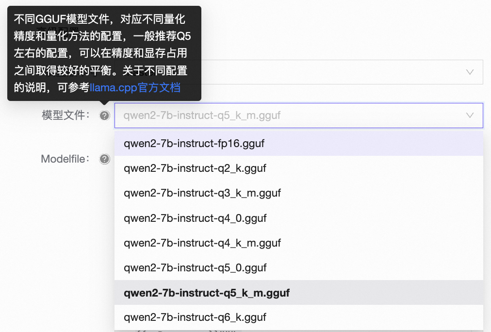 -模型文件:GGUF格式极大简化了大语言模型文件的管理,可通过单模型文件完成推理。而且借助llama.cpp提供的丰富量化能力,一个模型repo下的不同GGUF文件,通常对应的是不同量化精度与量化方法。平台默认选用的是Q5_K_M版本,在推理精度以及推理速度,资源消耗之间做一个较好的均衡。如果有特殊的需求,也可以选择更高的精度--例如FP16版本,或者更激进的量化(更小的模型文件)--例如Q2_K版本。