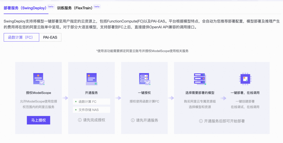 SwingDeploy提供了将ModelScope上的开源模型,部署到云上并提供OpenAI API接口的服务。 前置工作:首先从魔搭站点的模型服务页面进入部署服务:https://www.modelscope.cn/my/modelService/deploy。如果之前没有用过SwingDeploy服务,需要先配置一下ModelScope账号和阿里云账号的绑定,并开通FC服务授权。 注:开通服务和授权均为免费,另外绑定阿里云账号的话,还可以在ModelScope Notebook上薅100个小时的GPU免费算力。