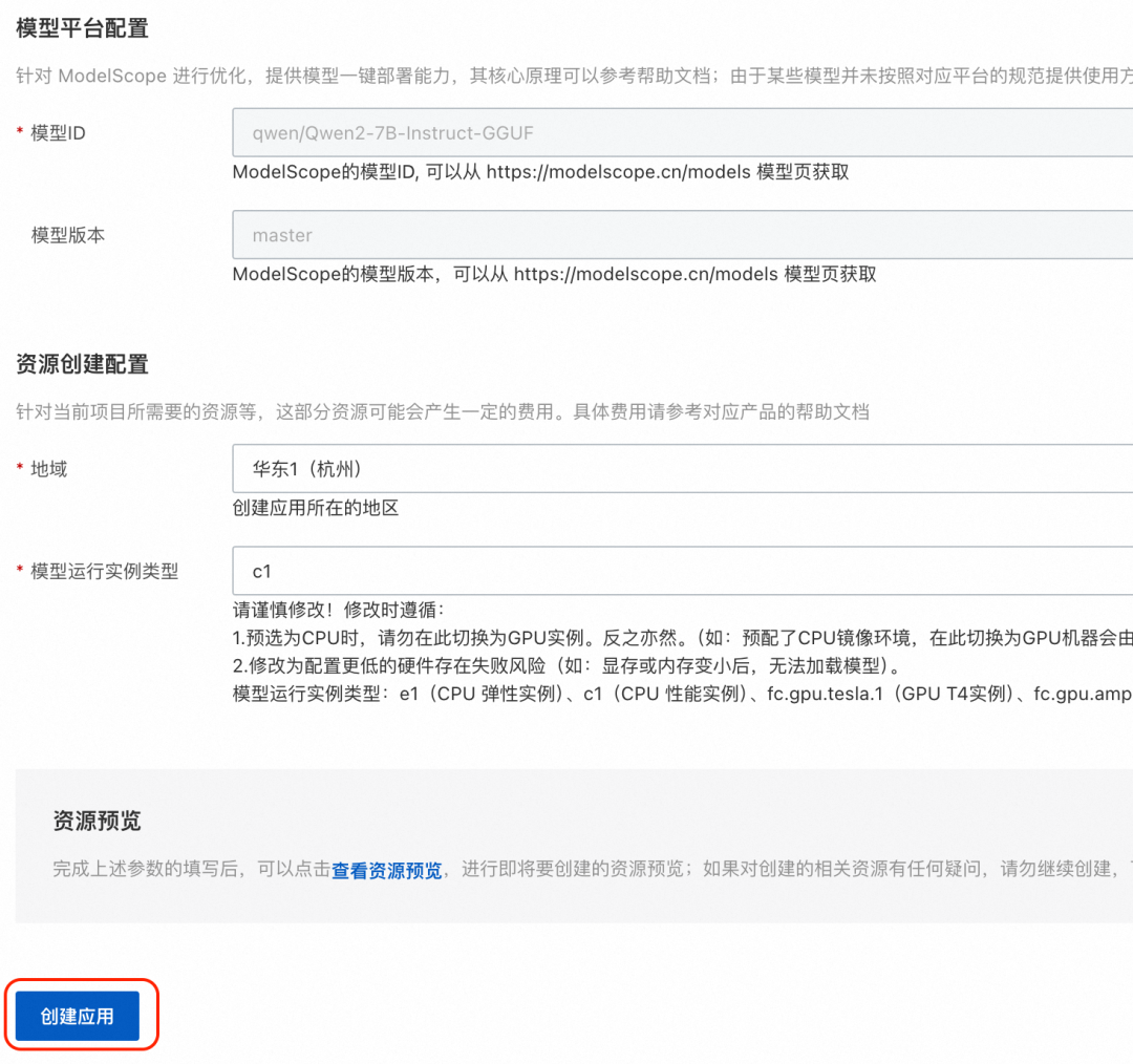 在这里,我们可以看到,在“原生部署”链路之外,新增了“OpenAI API兼容部署”页面。当前首先支持了Ollama推理框架。在这个页面上,可以选择想要部署的模型。这里我们以Qwen2-7B-Instruct为例,点击一键部署即进入函数计算FC的部署页面,点击“创建应用”即开始部署。