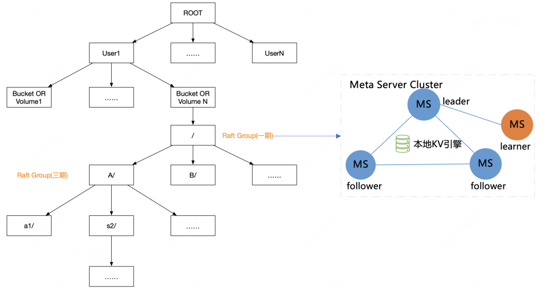 • 一个集群可以管理N个元服务分组,一个元服务管理N个桶/卷。