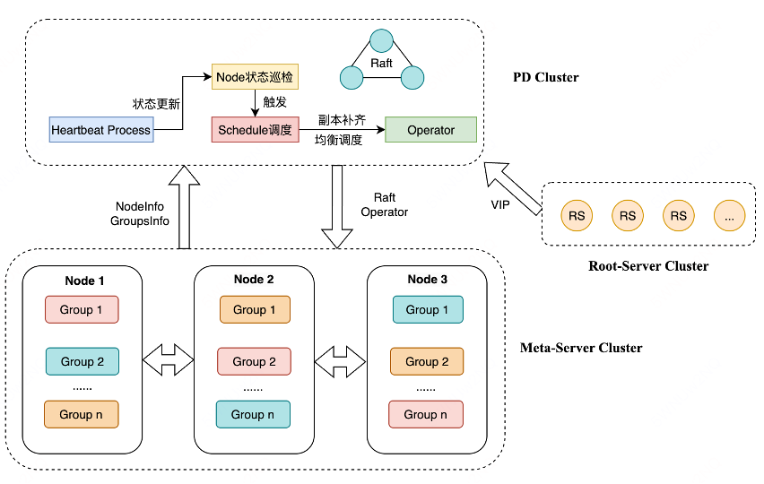 • 一个集群管理N个存储引擎分组,每个分组可以管理M台机器(可配置)。故障域为一个分组池,异常最大影响一个分组,可随时设只读,分组间数据可自动或半自动平衡。所以一个集群最终可管理N*M个节点。