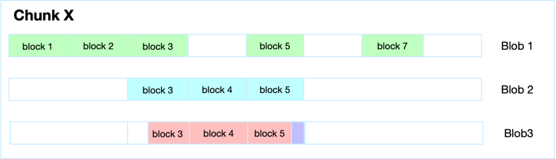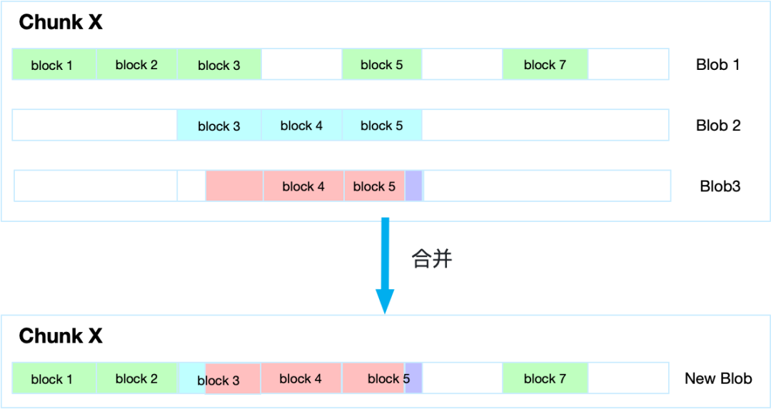 文件在读的场景时,读取到某个Chunk时,会将所有了Blob进行合并,获取到一个新的Blob,在将新的Blob对应的数据块Block返回给上层调用服务。具体如下图所示: