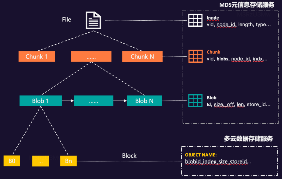Chunk和Blob数据信息我们存储到自研的MDS元信息存储服务中,而Block分块,我们存储在自研的数据存储服务或公有云的S3、cos、oss等产品中。