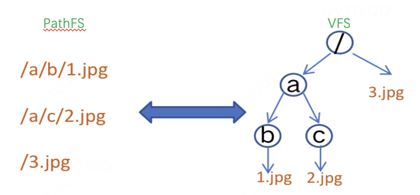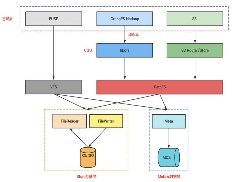 我们在 OrangeFS 实现上封装相对路径的VFS层和绝对路径的PathFS层。VFS提供给Posix协议使用,封装了文件所有操作接口,包括:打开、创建、读、写、同步等操作。PathFS提供给 S3、HDFS 协议使用,主要是单文件多个操作集合,例如:上传文件,就是创建、写操作集合。具体如下图所示: