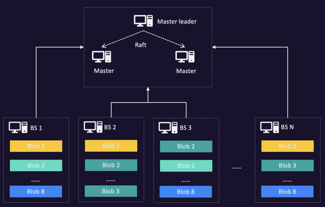 BS存储引擎是一套自研的数据分片存储系统,主要是基于facebook haystack论文件实现的。主要包含两大系统,Master server和 block server。Master server主要负责节点管理;block server主要负责数据分片存储。具体架构如下: