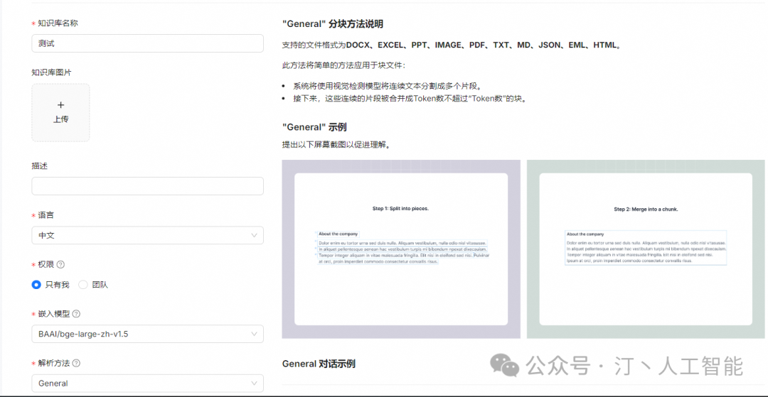 | General | Files are consecutively chunked based on a preset chunk token number. | DOCX, EXCEL, PPT, PDF, TXT, JPEG, JPG, PNG, TIF, GIF |