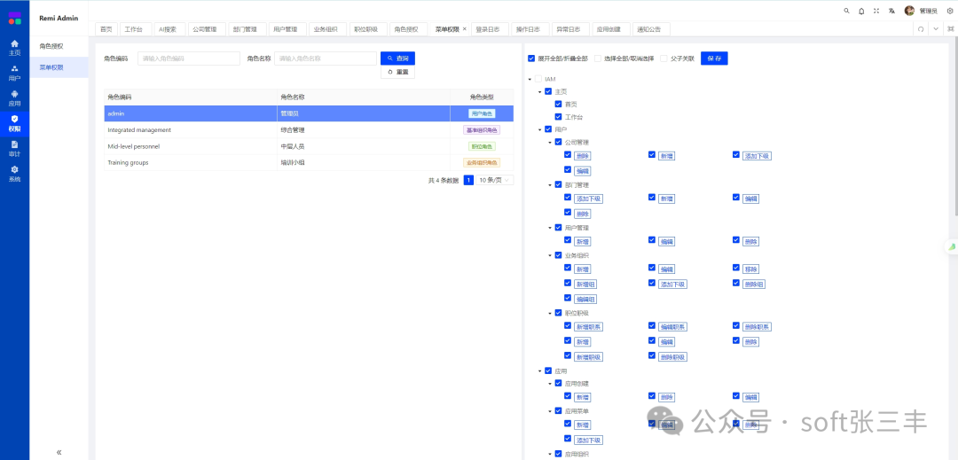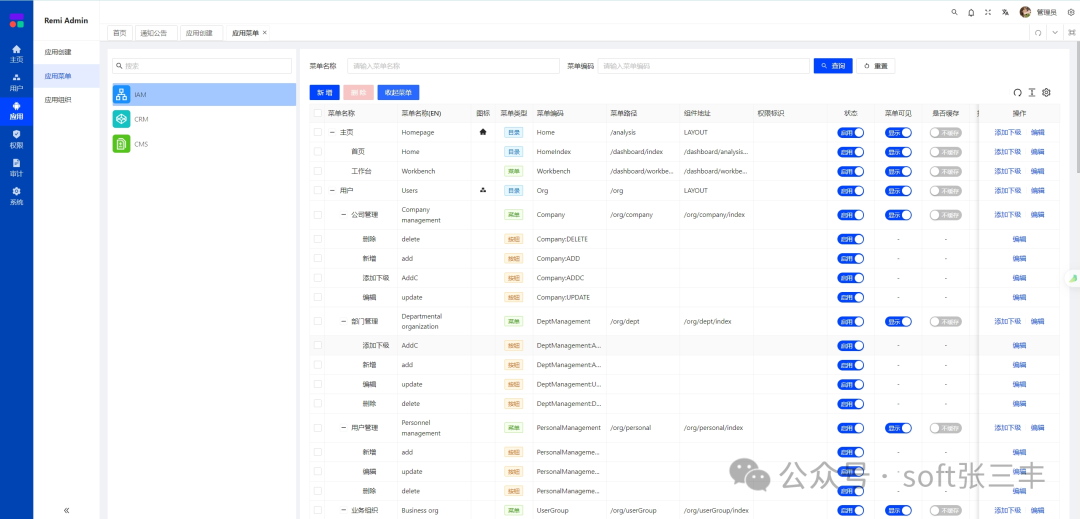 - 菜单管理:允许配置系统菜单、操作权限以及按钮权限标识等,以优化系统管理和使用效率。