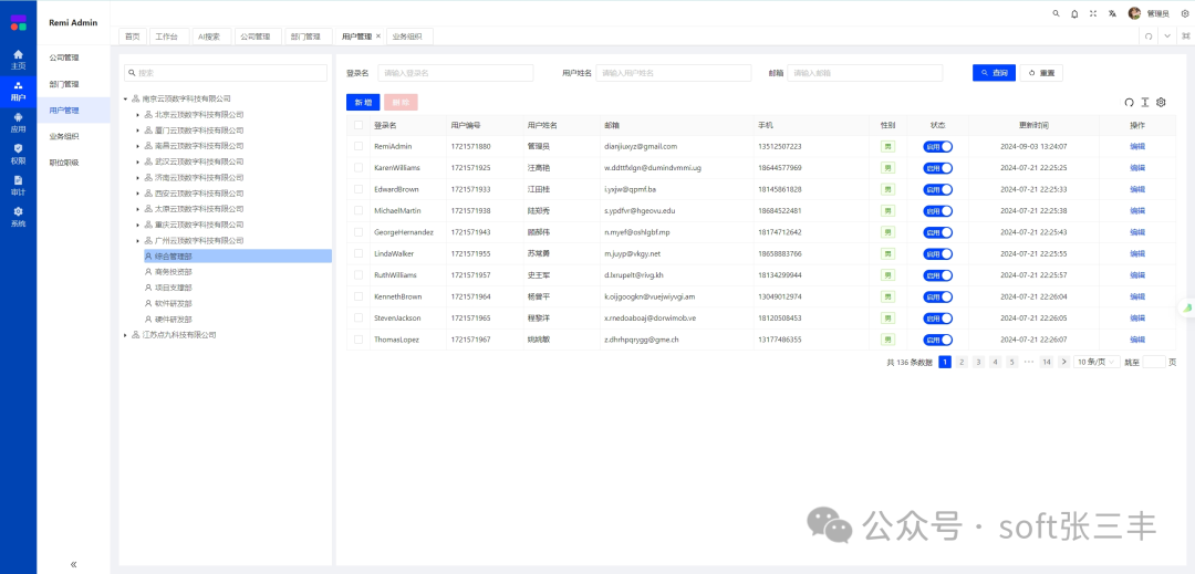 - 公司架构管理:设置基础组织架构,包括集团公司、分支机构、子公司、办事处等,并以树状结构进行展示。