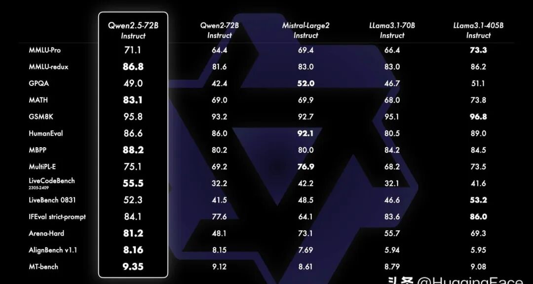 从基准测试来看,Qwen2.5-72B这一旗舰模型以其720亿参数的规模,在与其他开源模型如Llama-3.1-70B、Mistral-Large-V2等进行比较时表现优异。即便面对更大规模的Llama-3-405B,它也展现出了不俗的竞争力。这不仅证明了Qwen2.5在技术上的领先地位,也为未来的发展奠定了坚实的基础。 对于编程爱好者来说,Qwen2.5-Coder无疑是一个理想选择。尽管它体积较小,但在多种编程语言和任务中表现出色,甚至超越了许多大型语言模型。这一成果,不仅反映了技术的发展,更是对开发者需求的一种积极回应。