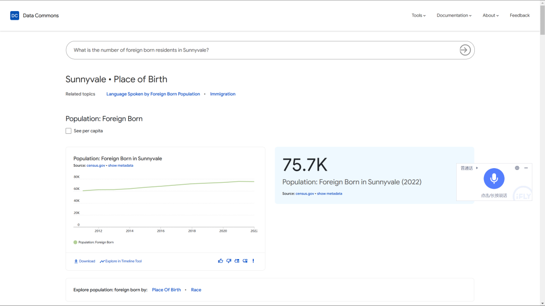 模型生成了很多自然语言问题,我们可以将这些问题复制到 Data Commons 中的自然语言接口中。 比如,我们输入上面的第1个问题:“Sunnyville 的外籍出生人口数量是多少?”,模型给出了具体的数字,还提供了图表,