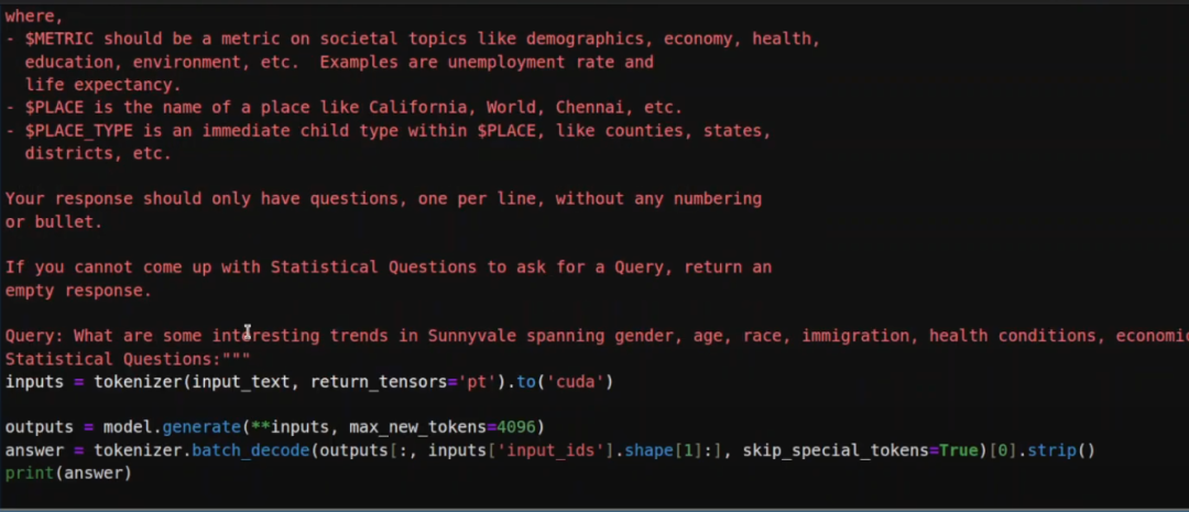 现在让我们看看如何使用这个模型进行推理。 我们给模型输入一个文本,要求它生成最多 25 个与查询相关的统计问题。模型将生成这些问题,我们将其转化为可理解的查询,并进行解码和打印。