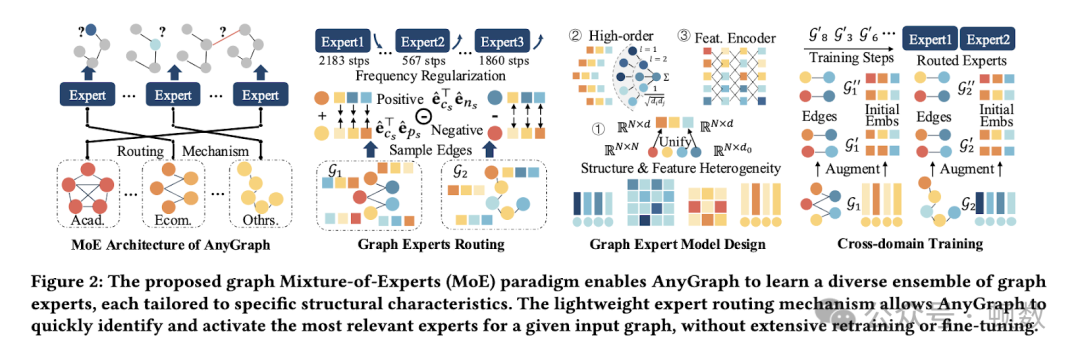 香港大学的研究人员推出了 AnyGraph,这是一种新颖的图基础模型,旨在克服图数据异构性的挑战。AnyGraph 建立在专家图混合 (MoE) 架构之上,使其能够管理结构级和特征级异构性的域内和跨域分布变化。该模型有助于快速适应新的图领域,使其在处理不同的图数据集方面具有高度通用性和高效性。利用 MoE 架构,AnyGraph 可以动态地将输入图路由到最合适的专家网络,从而优化其跨不同图类型的性能。 AnyGraph 的核心方法论围绕其对 Graph Mixture-of-Experts (MoE) 架构的创新使用。该架构由多个专门的专家网络组成,每个专家网络都经过定制以捕获图数据的特定结构和特征级特征。 AnyGraph中的轻量级专家路由机制使模型能够快速识别并激活给定输入图最相关的专家,从而确保高效、准确的处理。与依赖单一固定容量网络的传统模型不同,AnyGraph 的 MoE 架构使其能够动态适应不同图形数据集的细微差别。此外,该模型结合了结构和特征统一过程,其中不同大小的邻接矩阵和节点特征被映射到固定维度的嵌入。通过采用奇异值分解 (SVD) 进行特征提取来增强此过程,进一步完善模型跨不同图域进行泛化的能力。
