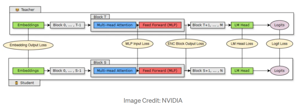 宽度剪枝(width pruning) 除了深度剪枝(depth pruning),Minitron还沿宽度维度进行剪枝(pruning),目标是注意力头(attention heads)、嵌入通道(embedding channels)和隐藏层。剪枝(pruning)后,重新训练有助于恢复初始剪枝步骤中丢失的一些性能。有趣的是,尽管宽度剪枝(width pruning)最初导致的损失高于深度剪枝(depth pruning),但重新训练使模型随着时间的推移更有效地恢复。 五、使用经典知识蒸馏(classical knowledge distillation)进行重新训练 剪枝(pruning)后,Minitron使用经典知识蒸馏(classical knowledge distillation)重新训练较小的模型。这涉及通过在模型的各个阶段(包括嵌入输出、logits和变压器架构中的特定损失)最小化损失来教导剪枝后的模型。学生模型(student model)通过比较不同层的输出从未剪枝的教师模型(teacher model)中学习。