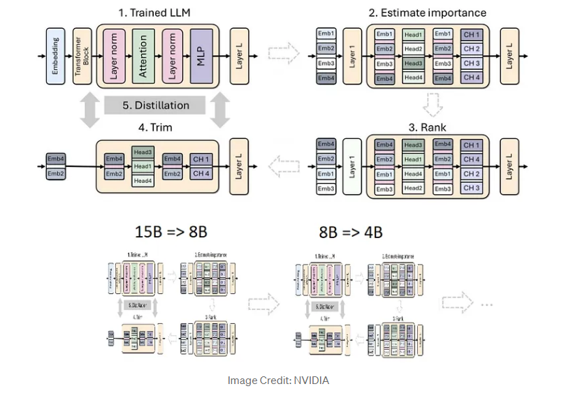 这张图片展示了如何通过剪枝(pruning)和蒸馏(distillation)技术将一个大型语言模型(LLM)逐步缩小为更小、更高效的模型。让我们一步一步地解释这个过程: