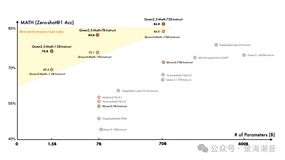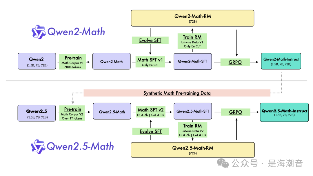 • 相比于 Qwen2-Math,Qwen2.5-Math 在更大规模的数学相关数据上进行了预训练,包括由 Qwen2-Math 生成的合成数据。