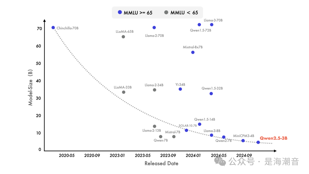 近来也出现了明显的转向小型语言模型(SLMs)的趋势。尽管历史上小型语言模型(SLMs)的表现一直落后于大型语言模型(LLMs),但二者之间的性能差距正在迅速缩小。值得注意的是,即使是只有大约 30 亿参数的模型现在也能取得高度竞争力的结果。附带的图表显示了一个重要的趋势:在 MMLU 中得分超过 65 的新型模型正变得越来越小,这凸显了语言模型的知识密度增长速度加快。特别值得一提的是,我们的 Qwen2.5-3B 成为这一趋势的一个典型例子,它仅凭约 30 亿参数就实现了令人印象深刻的性能,展示了其相对于前辈模型的高效性和能力。