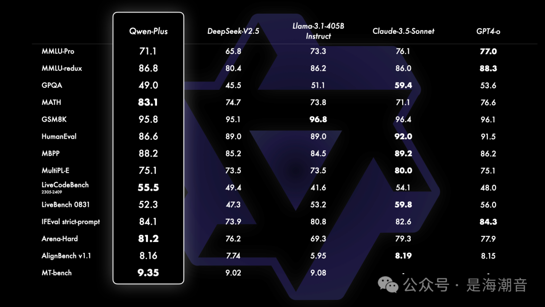 将基于 API 的模型 Qwen-Plus 与领先的专有和开源模型进行了对比,包括 GPT4-o、Claude-3.5-Sonnet、Llama-3.1-405B 和 DeepSeek-V2.5。这一对比展示了 Qwen-Plus 在当前大型语言模型领域中的竞争地位。结果显示,Qwen-Plus 显著优于 DeepSeek-V2.5,并且在与 Llama-3.1-405B 的竞争中表现出了竞争力,尽管在某些方面仍不及 GPT4-o 和 Claude-3.5-Sonnet