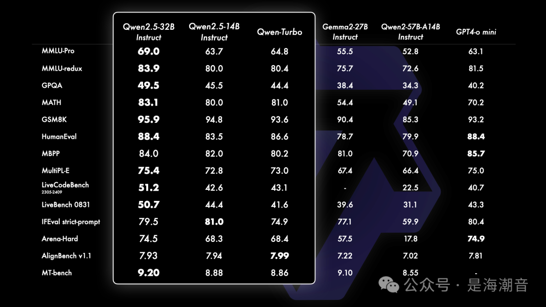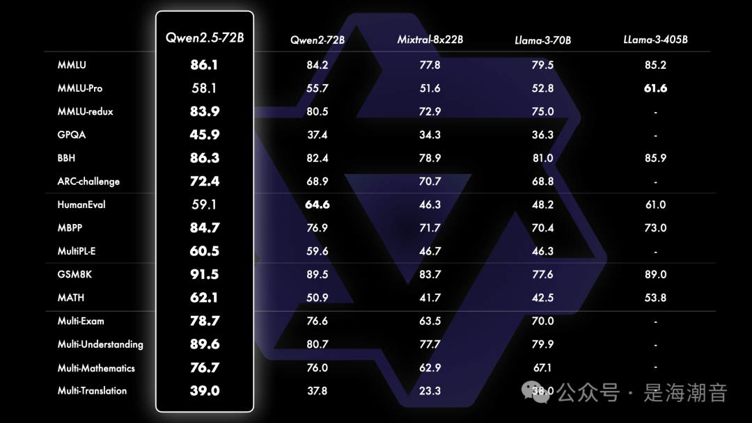 旗舰开源模型 Qwen2.5-72B 的基础语言模型性能达到了顶级水准,即便是在与 Llama-3-405B 这样更大的模型对比时也是如此。