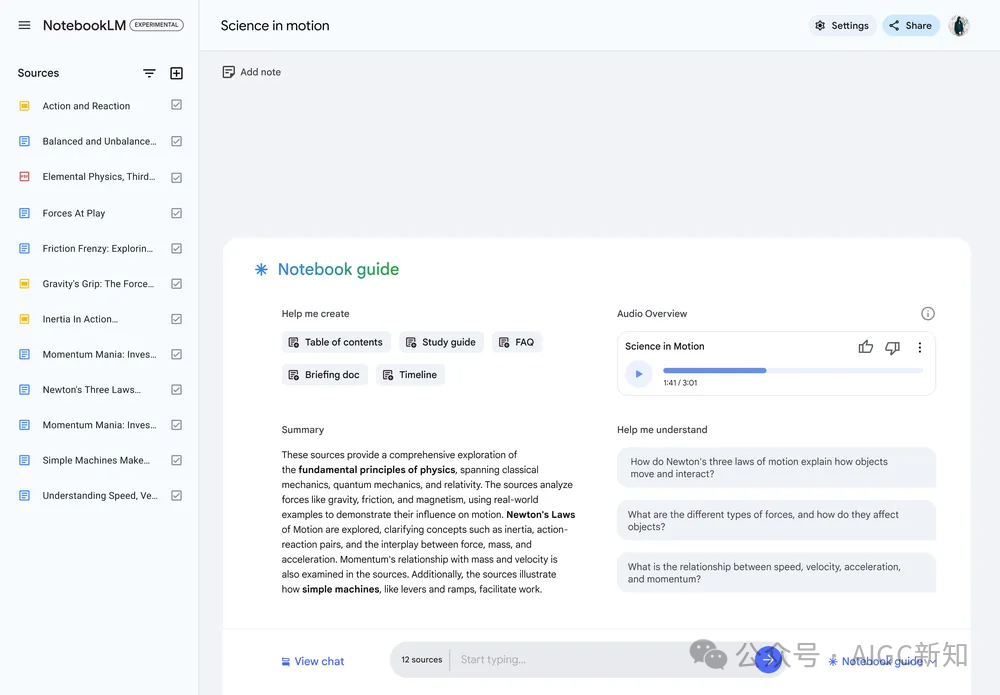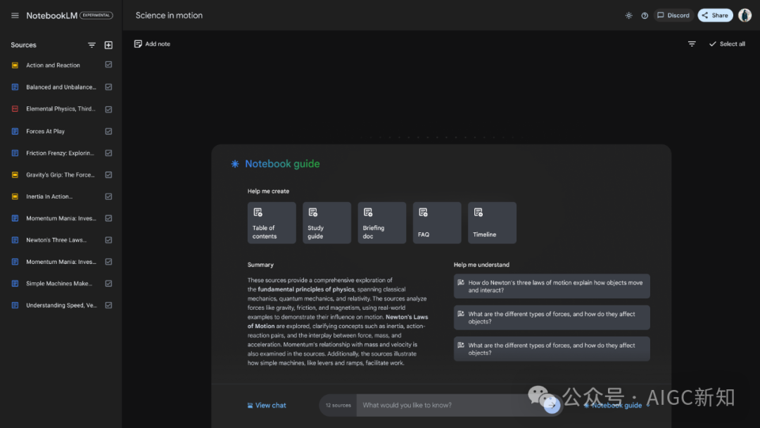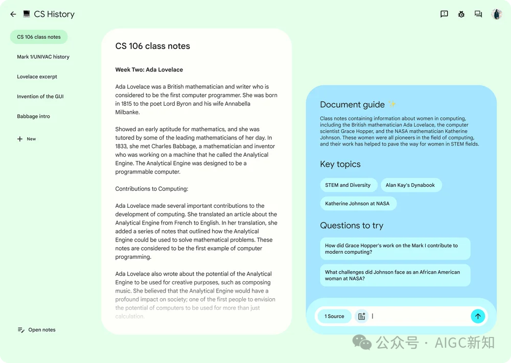 使用NotebookLM,可以自动获取文档摘要和关键问题,提问以深入了解上传的文件。 它还能减少错误信息的风险,并帮助用户轻松核查事实。