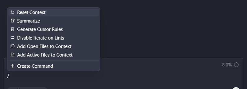 或者使用 Cursor 命令/Reset Context来讲上下文重置为默认