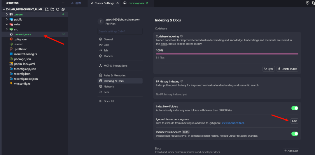 🧹 3、补充:维护与优化 .cursorignore 别忘了创建并配置.cursorignore文件,它的作用类似.gitignore,在大型代码库中,排除无关部分,以加快索引并更准确地定位文件。 并且排除文件也可以提高安全性,限制敏感信息的访问,Cursor 会屏蔽被忽略的文件,但由于 LLM 的不可预测性,无法保证绝对防护。
