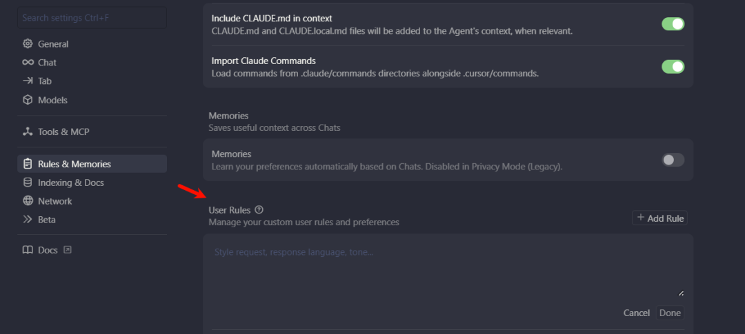 4 使用建议 4.1 Rules 提升开发效率 在实际工程中,仅靠自然语言对话很难让 AI 始终遵守项目约定。为了让 AI 理解团队的技术栈、编码风格与约束条件,将项目规范以 Rules(规则)的形式注入提示链是最有效的方式之一,能显著减少重复沟通与低级错误,让 AI 始终在一致的上下文中工作。 在转转的实践中,我们通过IDE 插件机制来分发统一维护的 Rules 文件,支持版本化管理,使团队成员都能保持相同的 AI 行为标准。 📘 1、Cursor 的四类 Rules(及其最佳实践) 目前,Cursor 支持四种类型的规则文件,每种都有不同的作用范围与应用场景。 在理解类型的同时,我们也可以针对每类规则配置相应的内容结构,从而发挥最大效用。 参考文档:https://cursor.com/cn/docs/context/rules User Rules