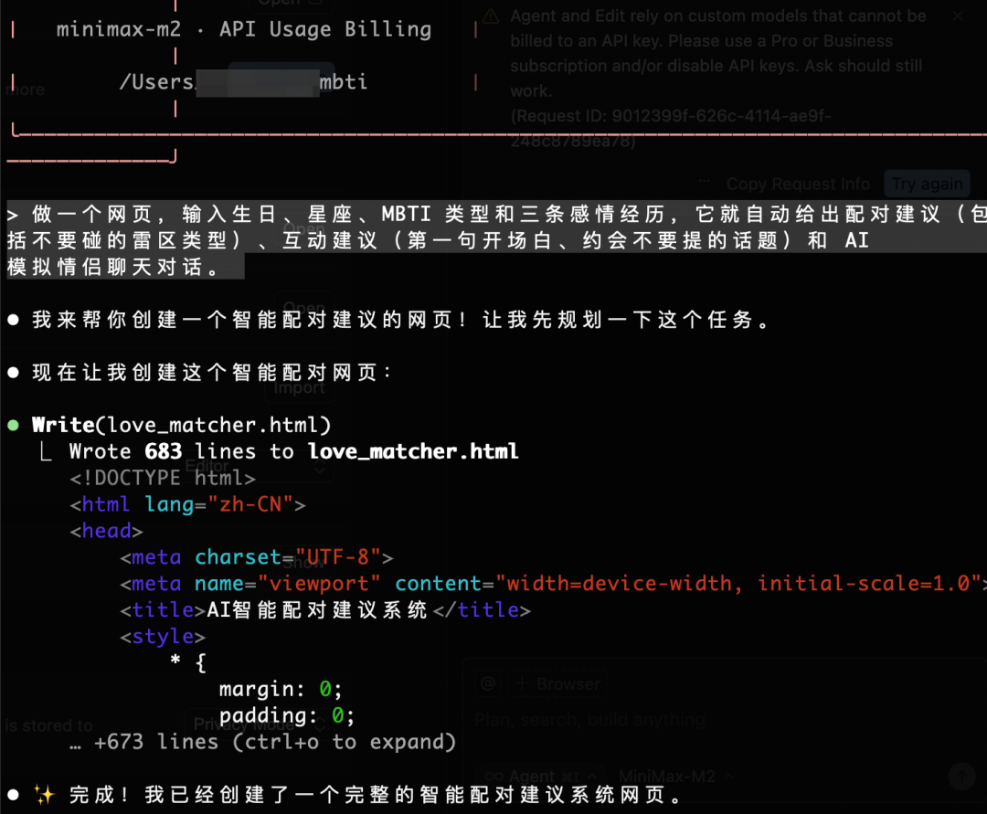 就能开始在 Claude Code 里愉快使用 MiniMax-M2 写代码了。
