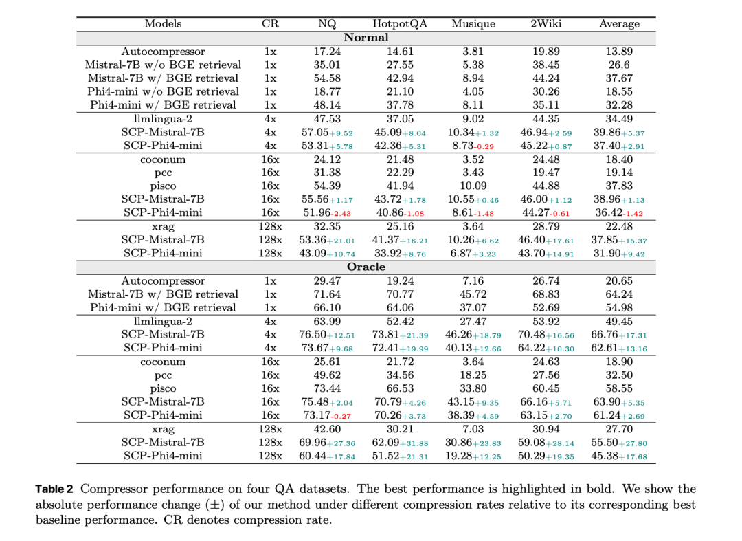 • 4x 压缩率:SCP-Mistral-7B 的平均 F1 达到39.86