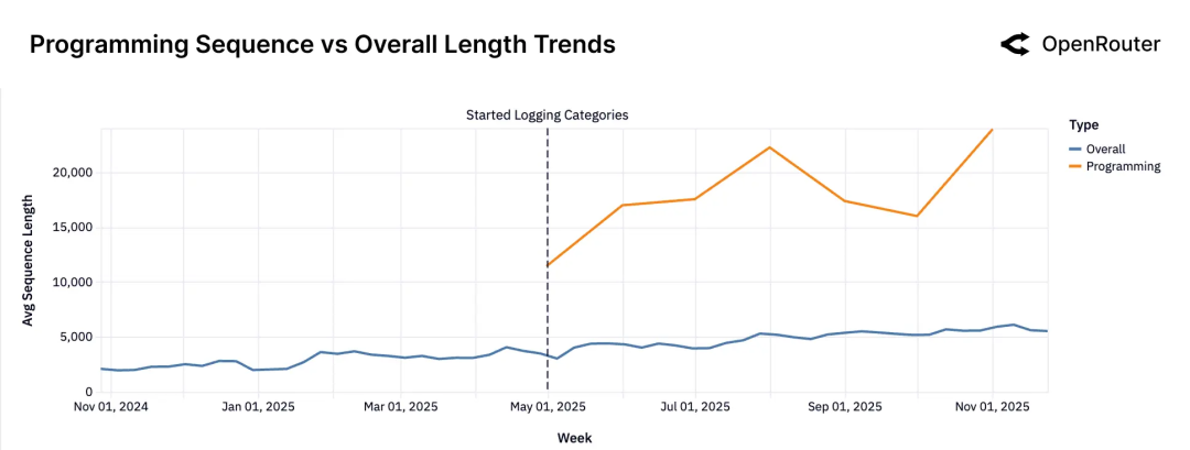 从 OpenRouter 最近发布的报告[2]上指出,"当前,LLM 在实际生产中的应用正经历一场根本性转变:从单轮文本补全,转向多步骤、工具集成、强推理驱动的工作流。我们将这一转变称为“智能体式推理”(agentic inference)的兴起——即模型不再仅用于生成文本,而是被部署为能够主动规划、调用工具、并在延展上下文中持续交互的“行动者”。其中最关键的包含序列长度分布的变化,以及编程类应用场景如何推动整体复杂性提升"。