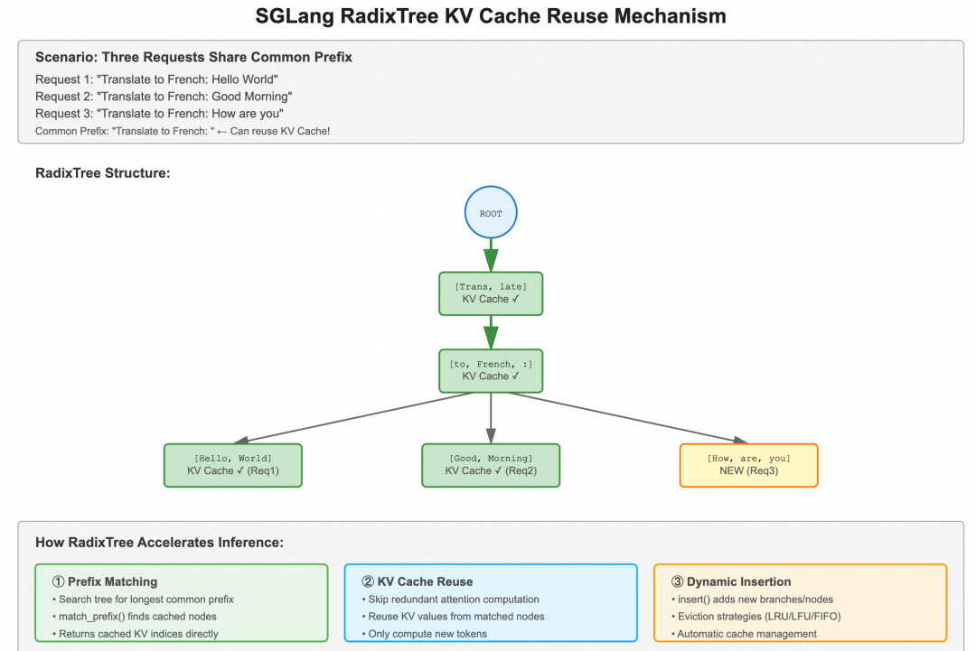 SGLang 的RadixTree正是为解决这一痛点而生。RadixTree(基数树)是一种高效的前缀检索数据结构,SGLang 利用它来管理和索引所有已缓存的 token 序列。当新请求到达时,系统在 RadixTree 中检索其 token 序列,找到与已缓存序列的最长公共前缀,直接复用对应的 KVCache,仅对剩余的新增 token 执行 Prefill 计算。