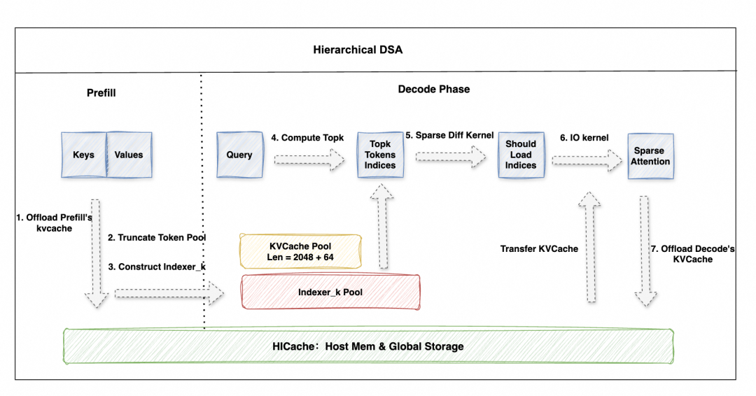 然而,现有稀疏化方案仍需在 GPU 显存中保留全量 KVCache,长上下文场景下的显存瓶颈依然存在。为此,我们正在 SGLang 中构建分层稀疏注意力框架,结合 HiCache 实现 KVCache 的分层卸载与按需加载,仅在 GPU 中保留需要的 Topk KVCache,从而突破显存容量限制,显著提升可支持的 Batch Size 与系统吞吐。