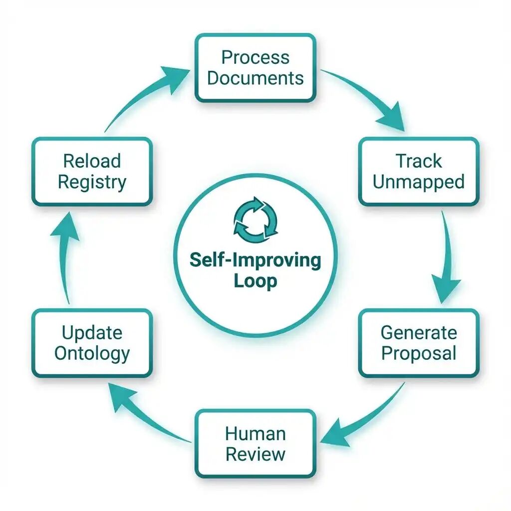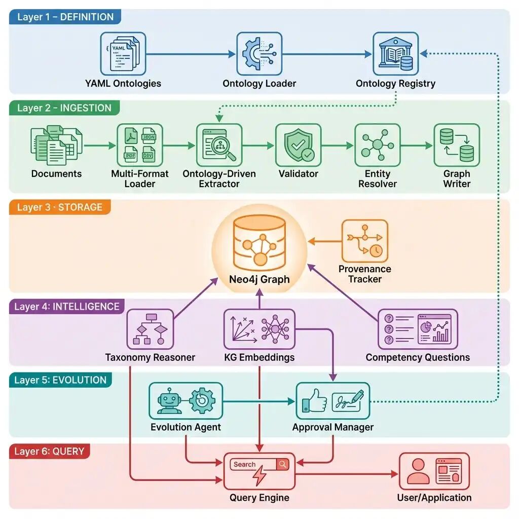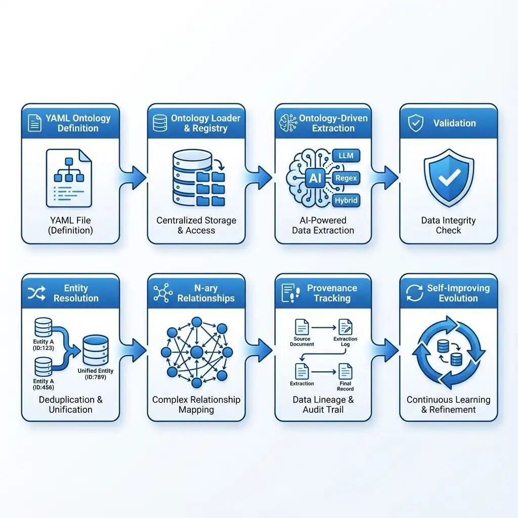我们构建了不同的系统。将本体视为静态的模式文件是不够的;我们让它成为整个管道的中央神经系统。它不仅定义实体,还控制提取、强制验证、启用推理、追踪来源,并基于使用模式自进化。