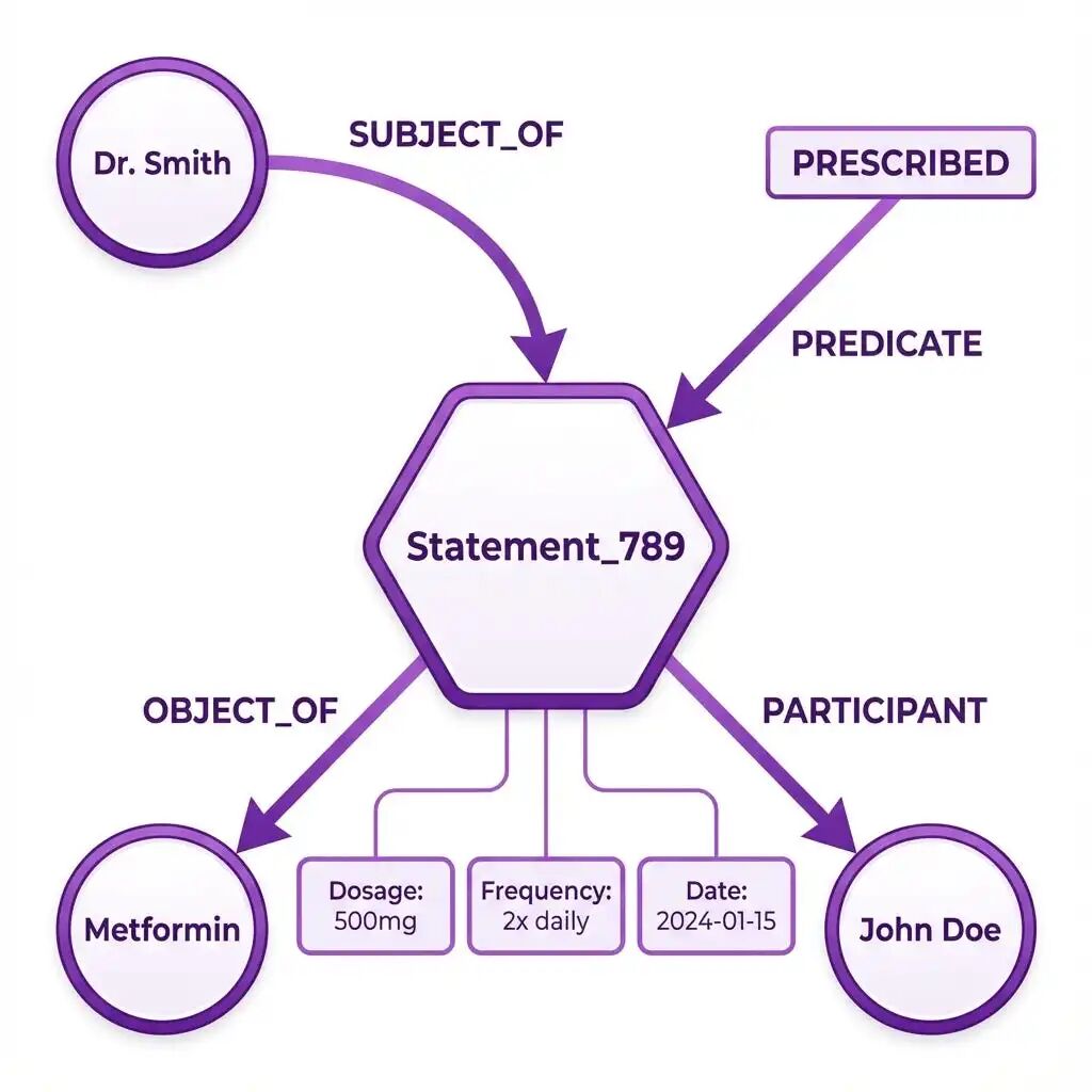 想象一下:从一份报告中提取“John Doe, 45”,另一份中是“John Doe, age 45”,结果生成了两个独立的患者节点。文档A中是“Type 2 Diabetes”,文档B中是“T2D”,导致同一疾病创建了三个不同节点。更糟糕的是,“500mg twice daily”的剂量信息完全丢失,因为简单的(Patient)-[PRESCRIBED]->(Medication)边无法存储这些细节。