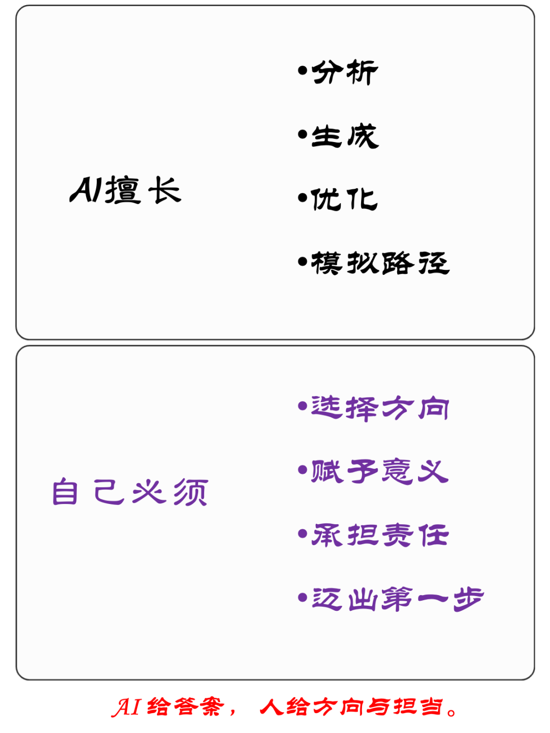 很多人不是不知道该怎么做,而是不敢转型、怕失败,不敢砍项目、怕担责,不敢推改革、怕冲突,不敢跳出舒适区、怕“万一不如现在”——这从来不是认知问题,而是心理与责任问题。而这正是 AI 无法替代、也无法外包给任何工具的部分。