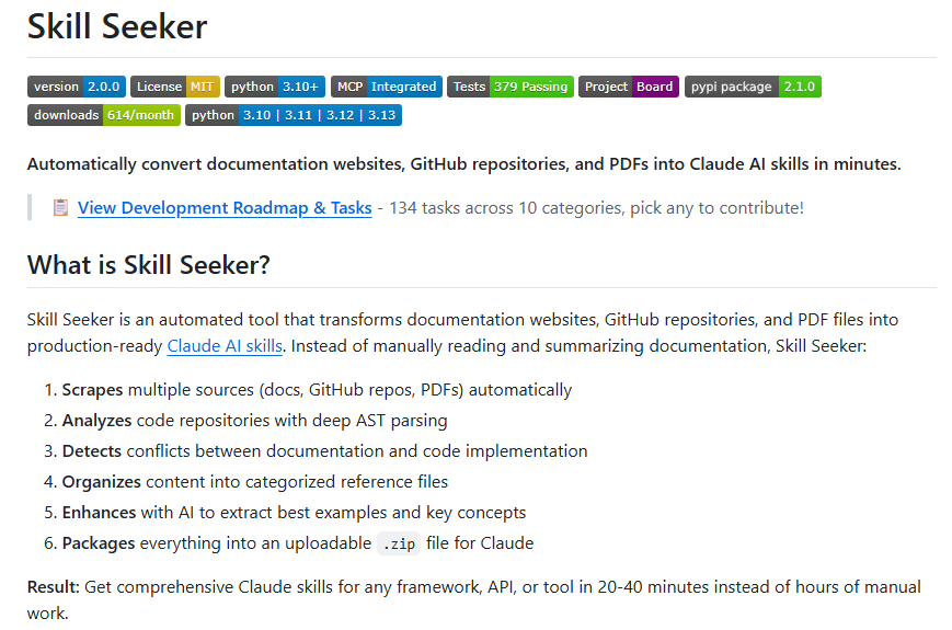Skill Seeker 是一款开源的工具,专门解决手动创建 Claude Skills 的痛点: