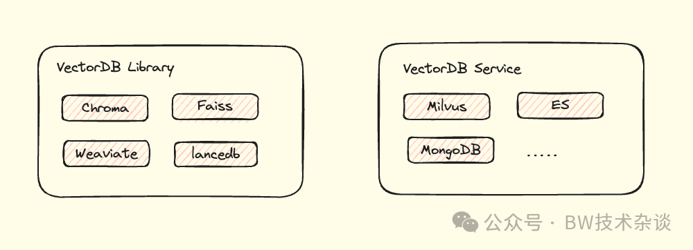 如下图所示,左面列出了嵌入式向量库,右面列出了一些数据库类型的向量库,可以看到,大部分数据库形式的向量库,是由传统厂商改造而来的,在之前的数据库产品中加入了向量检索的能力。