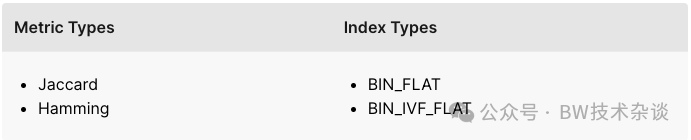 •对于二进制类型嵌入向量(binary embedding),主流向量库提供的相似性度量如下表