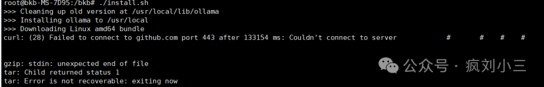 Ubuntu24.04安装ollama参考链接:https://zhuanlan.zhihu.com/p/20514173947如果执行一键安装命令curl-fsSLhttps://ollama.com/install.sh|sh国内直接安装ollama网速过慢退出,如下图