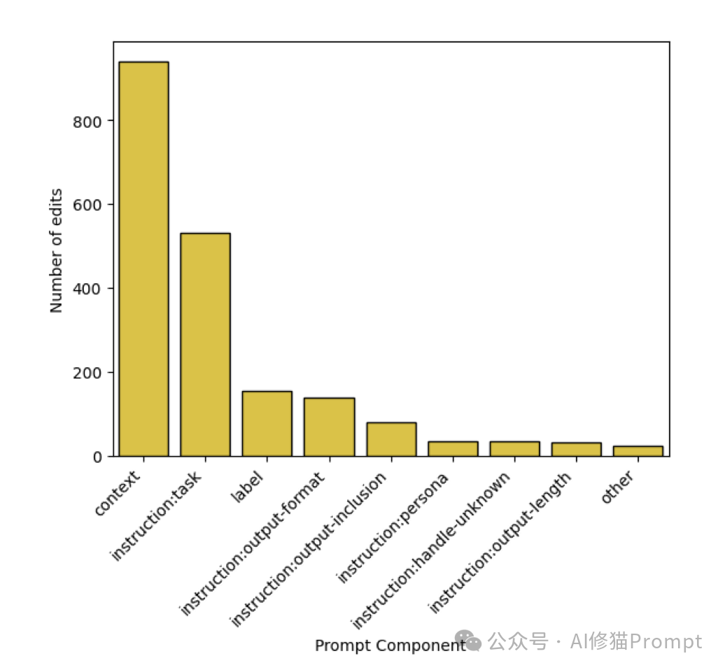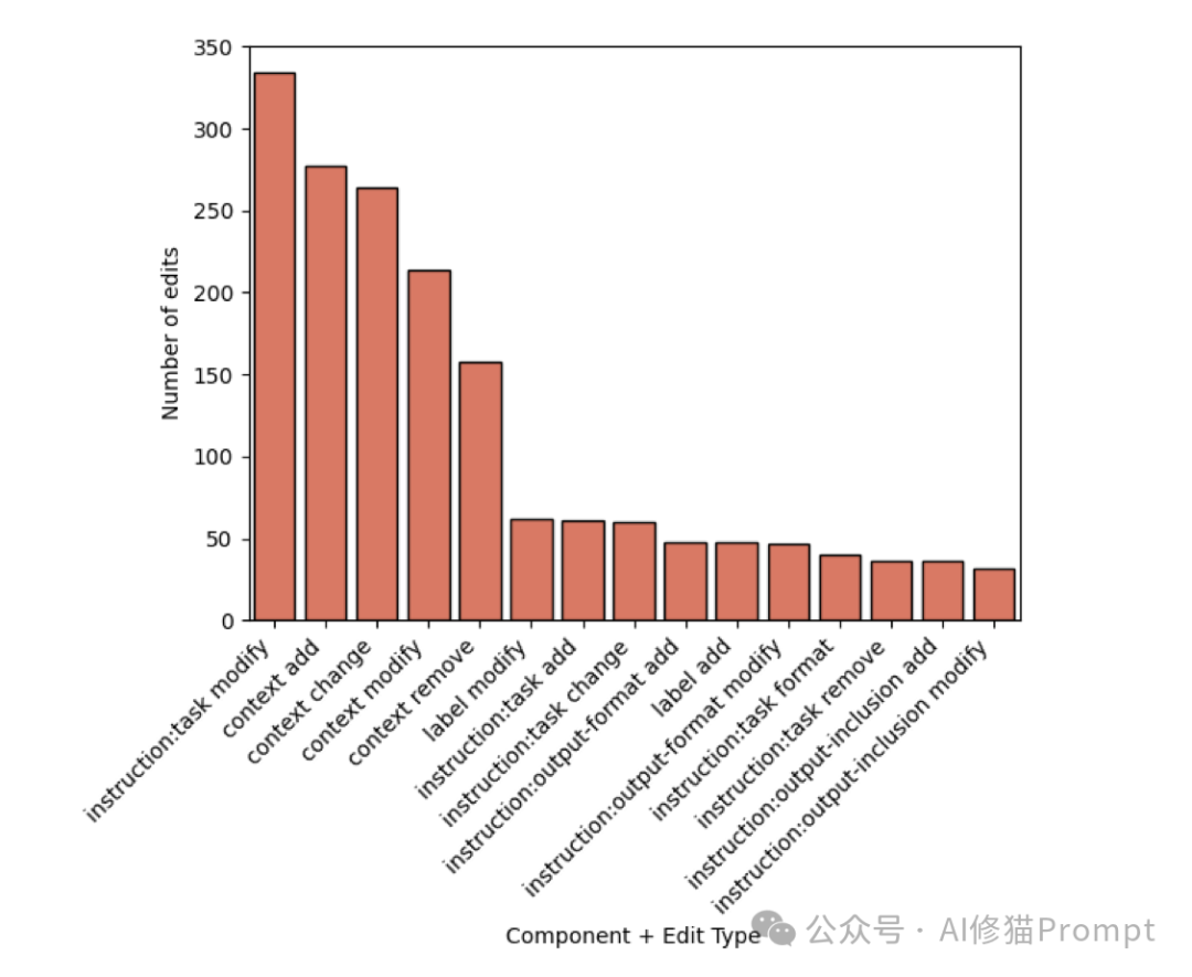 细致入微的编辑是Prompt工程的特色。研究发现,近四分之一的编辑涉及多处修改,平均约两处编辑同时进行。其中相当一部分涉及上下文和指令的同步修改。这种做法的合理性在于,更新上下文后,指令部分也要做出相应调整,否则可能会产生不一致的输出。
