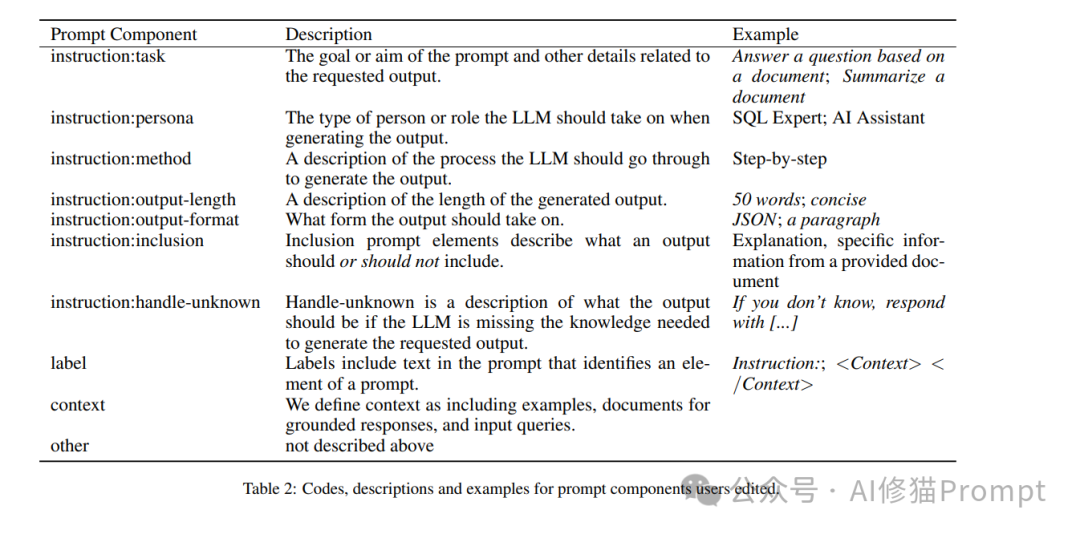 此图总结了Prompt中不同组成部分的作用和示例,有助于构建清晰可视化且有目标的Prompt,以指导LLM生成所需的输出。