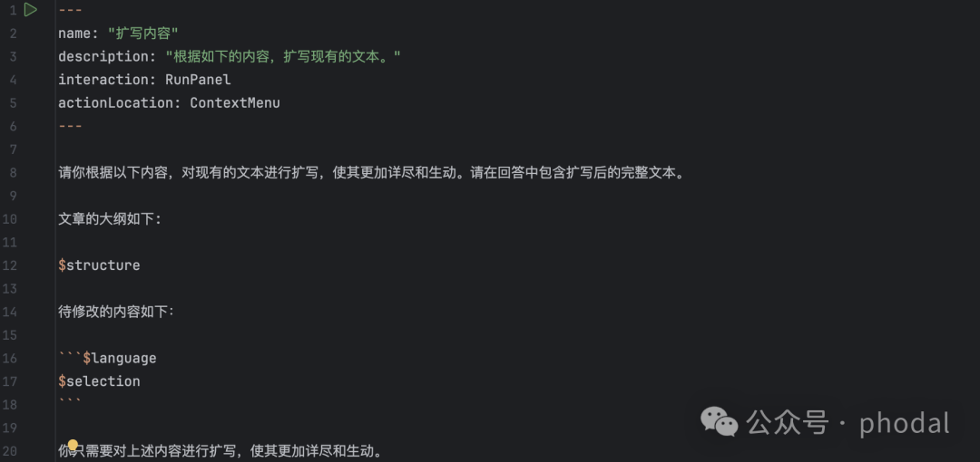 那么,剩下的就是 Runtime 的设计。在 AI IDE 场景下,Runtime 是 IDE,在手机 APP 场景下,Runtime 是 APP,诸如此类。也因此,我们还需要在 Runtime 中提供这种基础能力,以支持这种 DSL 的执行,比如 AutoDev 直接提供/refactor的指令,以支持代码重构。