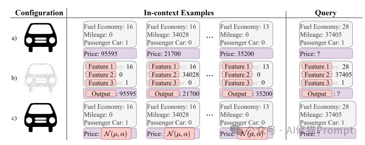 以上每种配置都包含了上下文示例和一个查询样本,模型需要为查询样本预测价格或输出值。这个实验设置允许研究者比较模型在不同信息可用性下的表现,从而洞察LLMs如何利用知识检索和从样例中学习。