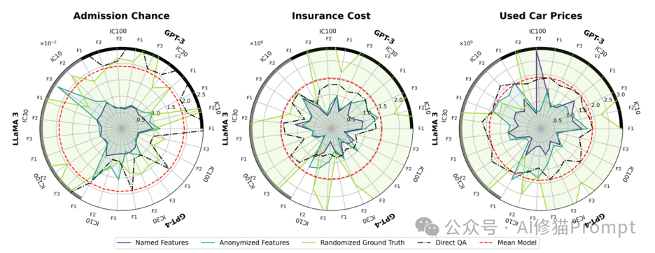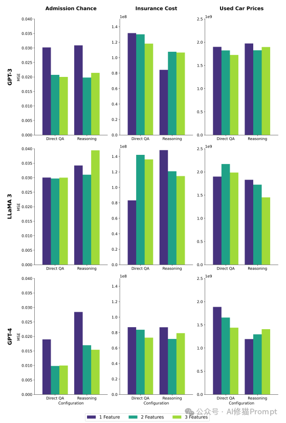 在论文的最后研究者提供了一张信息非常丰富的图表,比较了GPT-3、LLaMA 3和GPT-4三种模型在三个不同数据集(入学机会、保险成本和二手车价格)上的表现。图表展示了直接问答(Direct